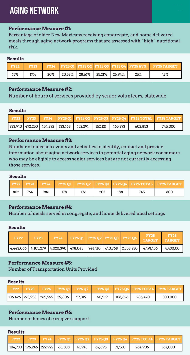- Our Aging Network oversees programs that impact older adults including senior services, food security, employment opportunities, capital outlay funding, and connection to services provided by New Mexico’s Area Agencies on Aging.
