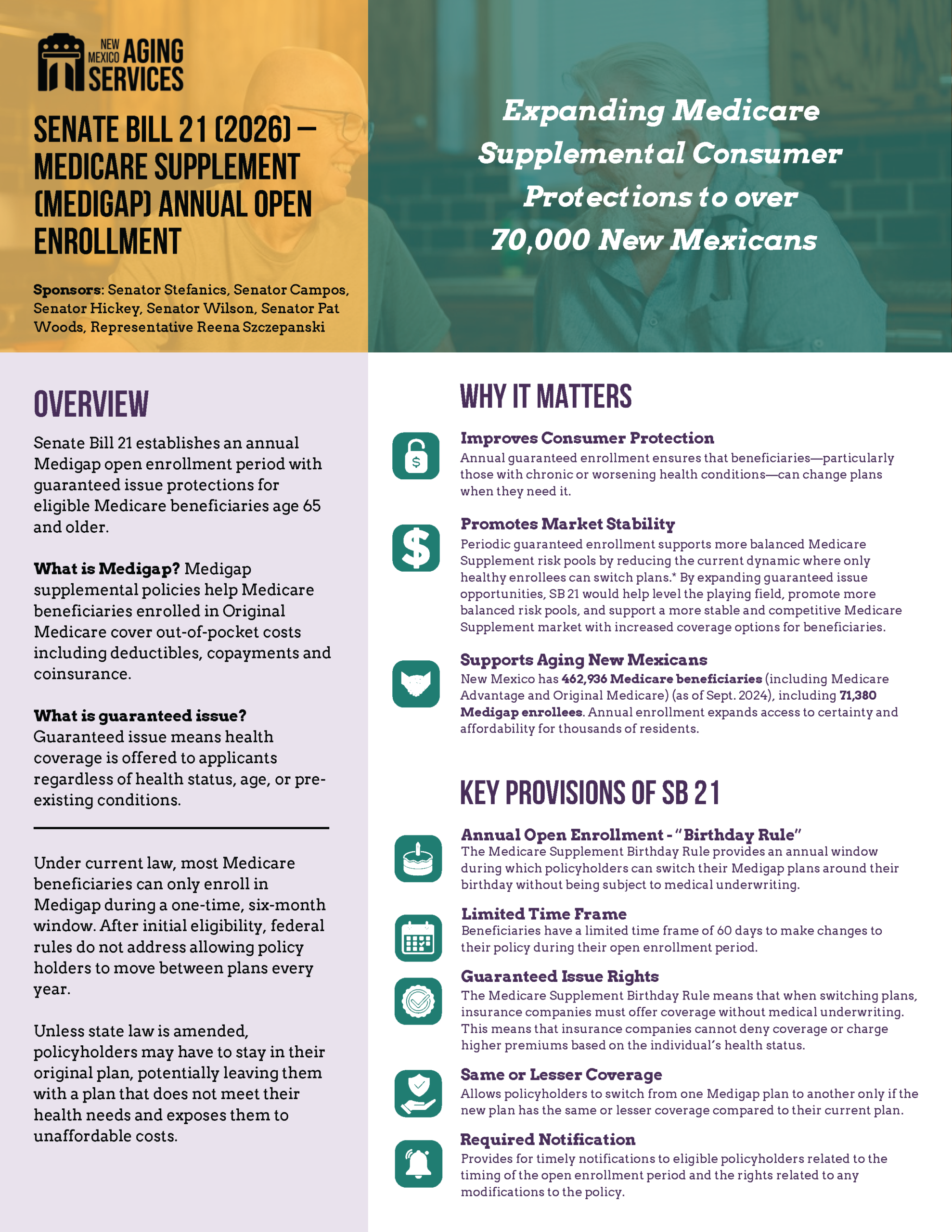 Senate Bill 21 establishes an annual Medigap open enrollment period with guaranteed issue protections for eligible Medicare beneficiaries age 65 and older.